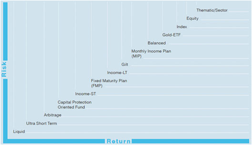 - Short-term funds, Medium-term funds, Long-term funds, Gilt fund, Treasury fund, Corporate bond fund, Infrastructure debt fund, Floating rate funds, Dynamic Bond funds, Fixed Maturity Plans